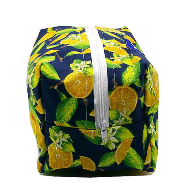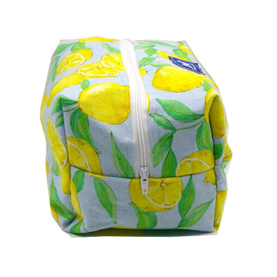 GRANDE TROUSSE CITRON BLEU à fermeture éclair, extérieur coton à motifs colorés, intérieur waterproof. Lanière de transport ou d’accrochage. Finitions renforcées. Sa grande contenance vous permettra de transporter tous vos accessoires de toilette.