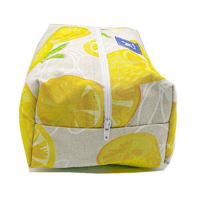 GRANDE TROUSSE CITRON BEIGE à fermeture éclair, extérieur coton à motifs colorés, intérieur waterproof. Lanière de transport ou d’accrochage. Finitions renforcées. Sa grande contenance vous permettra de transporter tous vos accessoires de toilette.
