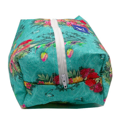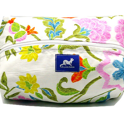GRANDE TROUSSE FLORIANE à fermeture éclair, extérieur coton à motifs colorés, intérieur waterproof. Lanière de transport ou d’accrochage. Finitions renforcées. Sa grande contenance vous permettra de transporter tous vos accessoires de toilette.