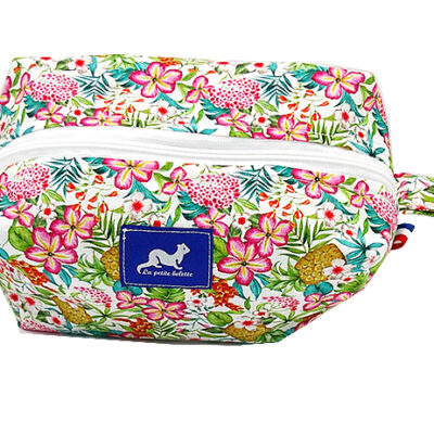 Trousse de toilette moyenne ANANAS ROSE à fermeture éclair, extérieur coton à motifs colorés, intérieur waterproof. Lanière de transport ou d’accrochage. Finitions renforcées.
