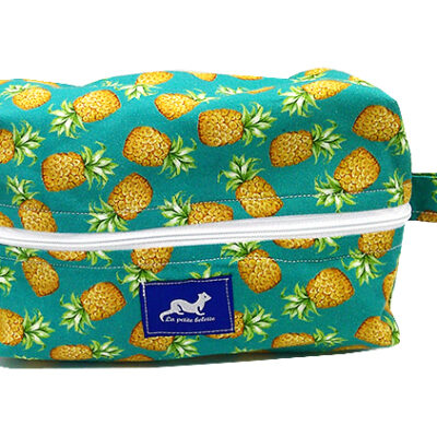 Trousse de toilette moyenne ANANAS VERT à fermeture éclair, extérieur coton à motifs colorés, intérieur waterproof. Lanière de transport ou d’accrochage. Finitions renforcées.