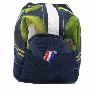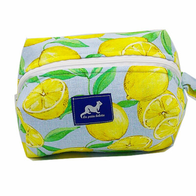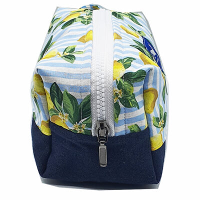 Trousse de toilette moyenne CITRON BLEU à fermeture éclair, extérieur coton à motifs colorés, intérieur waterproof. Lanière de transport ou d’accrochage. Finitions renforcées.