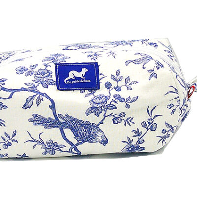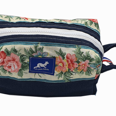 Trousse de toilette moyenne BICOLORE BLEU FLEURS PROVENÇALES à fermeture éclair, extérieur lin uni et coton à motif coloré, intérieur waterproof. Lanière de transport ou d’accrochage. Finitions renforcées.