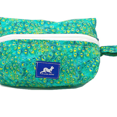 Trousse de toilette moyenne PAON à fermeture éclair, extérieur coton à motifs colorés, intérieur waterproof. Lanière de transport ou d’accrochage. Finitions renforcées.
