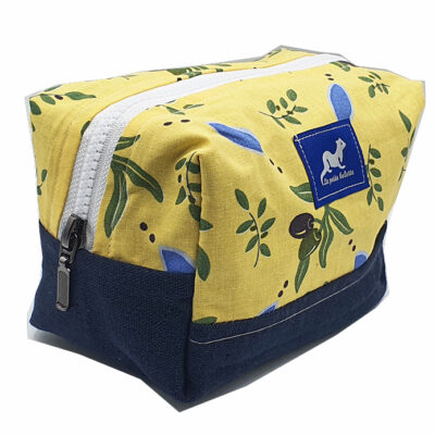Trousse de toilette moyenne BICOLORE CITRON BLEU à fermeture éclair, extérieur lin uni et coton à motif coloré, intérieur waterproof. Lanière de transport ou d’accrochage. Finitions renforcées.