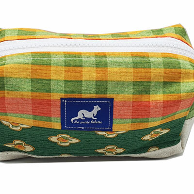 Trousse de toilette moyenne BICOLORE POMMES VERTES à fermeture éclair, extérieur lin uni et coton à motif coloré, intérieur waterproof. Lanière de transport ou d’accrochage. Finitions renforcées.