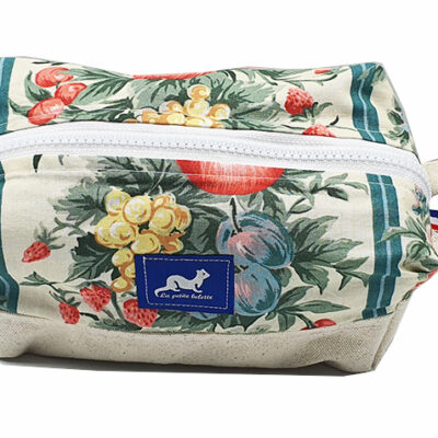 Trousse de toilette moyenne BICOLORE FRUITS PROVENÇAUX à fermeture éclair, extérieur lin uni et coton à motif coloré, intérieur waterproof. Lanière de transport ou d’accrochage. Finitions renforcées.