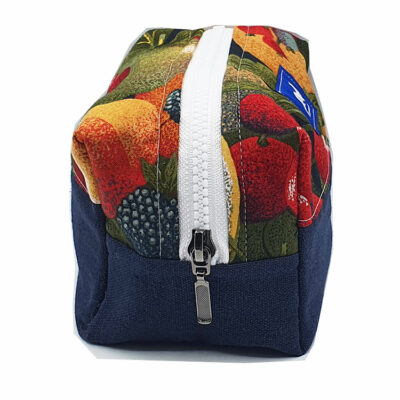 Trousse de toilette moyenne BICOLORE FRUITS ET FLEURS à fermeture éclair, extérieur lin uni et coton à motif coloré, intérieur waterproof. Lanière de transport ou d’accrochage. Finitions renforcées.
