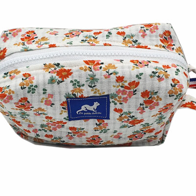 Trousse de toilette moyenne LINETTE à fermeture éclair, extérieur coton à motifs colorés, intérieur waterproof. Lanière de transport ou d’accrochage. Finitions renforcées.