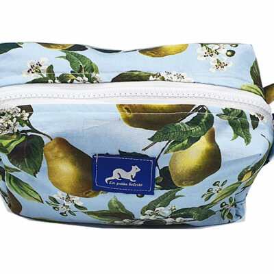 Trousse de toilette moyenne TROUSSE MOYENNE POIRES à fermeture éclair, extérieur lin uni et coton à motif coloré, intérieur waterproof. Lanière de transport ou d’accrochage. Finitions renforcées.
