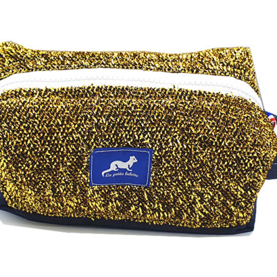Trousse de toilette moyenne BICOLORE SOLEIL D’ÉTÉ à fermeture éclair, extérieur coton et tissus doré, intérieur waterproof. Lanière de transport ou d’accrochage. Finitions renforcées.
