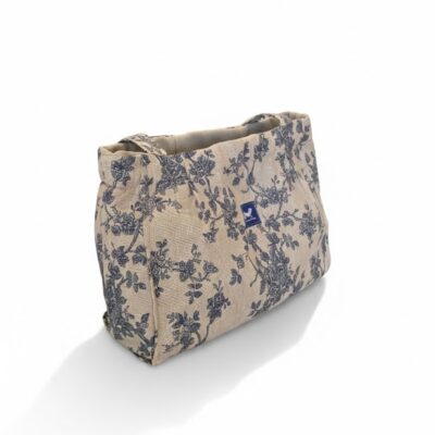 Découvrez le Tote Bag Mini MARIANNE B, un sac cabas artisanal en tissu coton et lin BEIGE ET BLEU MARINE aux motifs toile de Jouy.