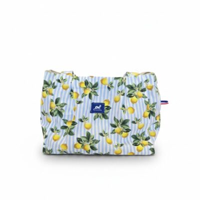 Découvrez le Tote Bag Mini CITRON R, un sac cabas artisanal en coton blanc à rayures bleues agrémentée de citrons.