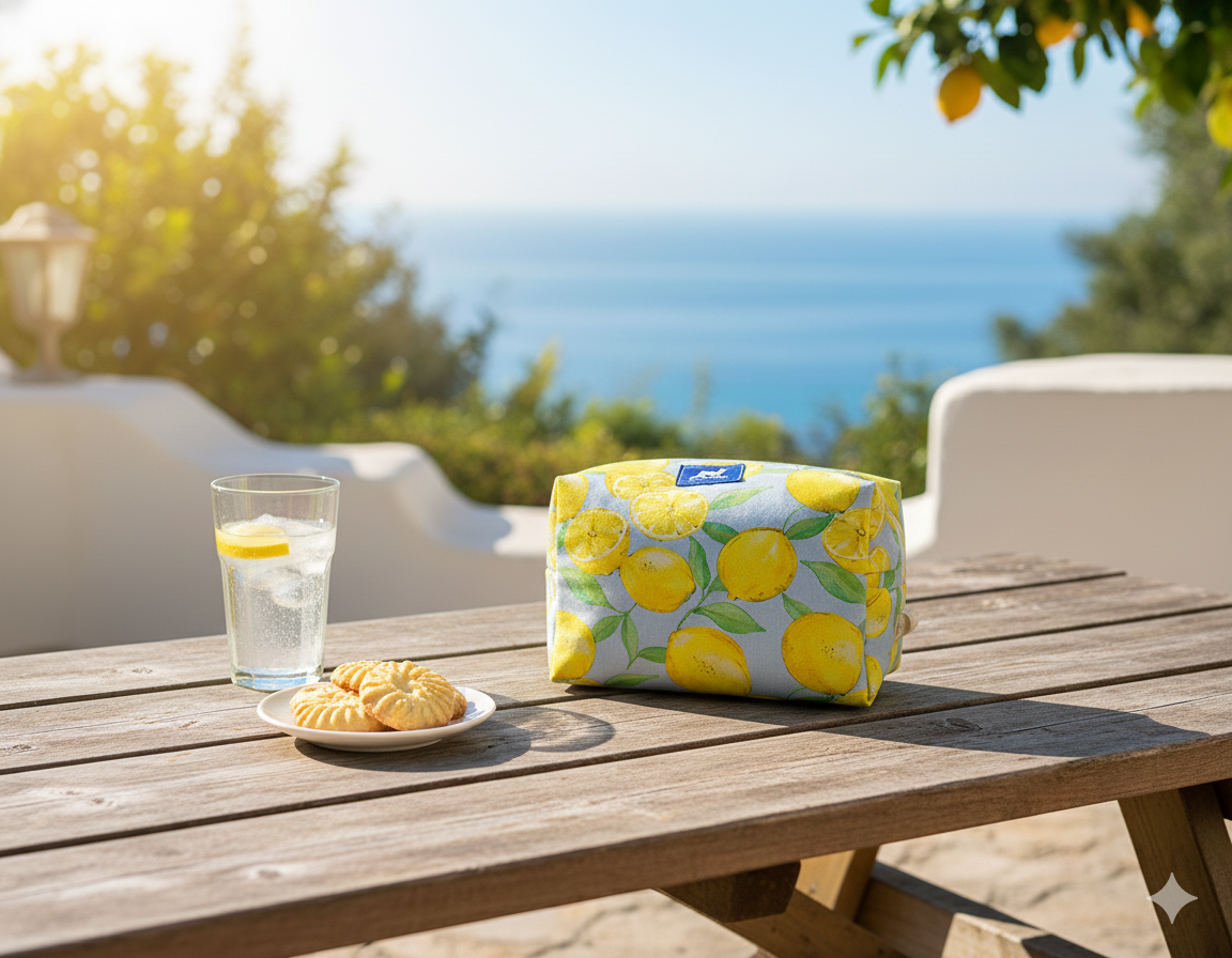 GRANDE TROUSSE CITRON BLEU à fermeture éclair, extérieur coton à motifs colorés, intérieur waterproof. Lanière de transport ou d’accrochage. Finitions renforcées. Sa grande contenance vous permettra de transporter tous vos accessoires de toilette.