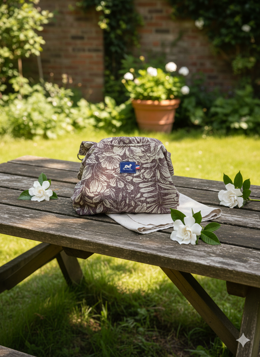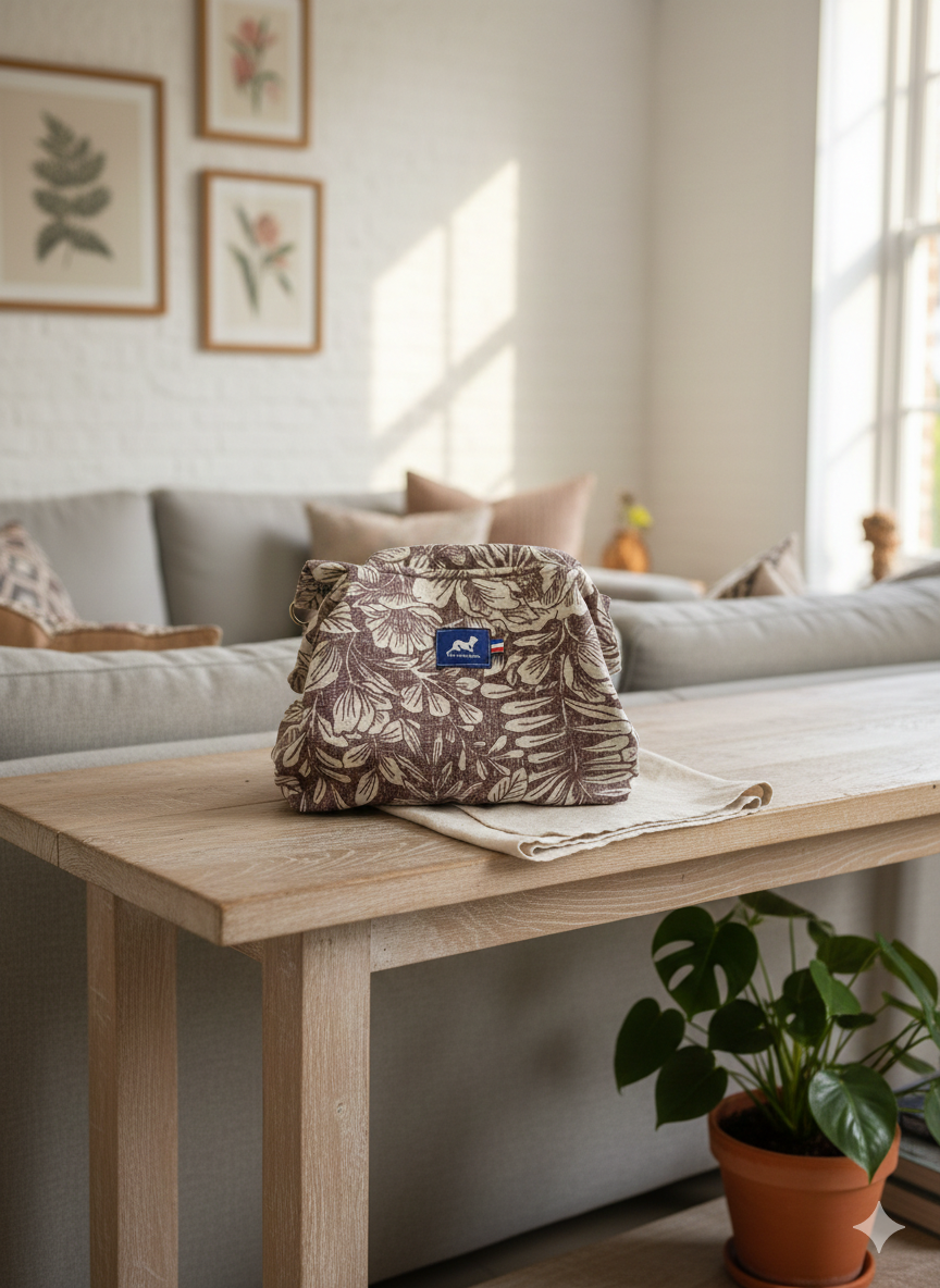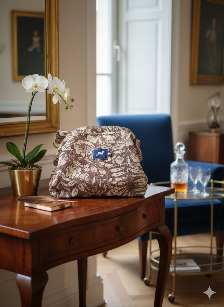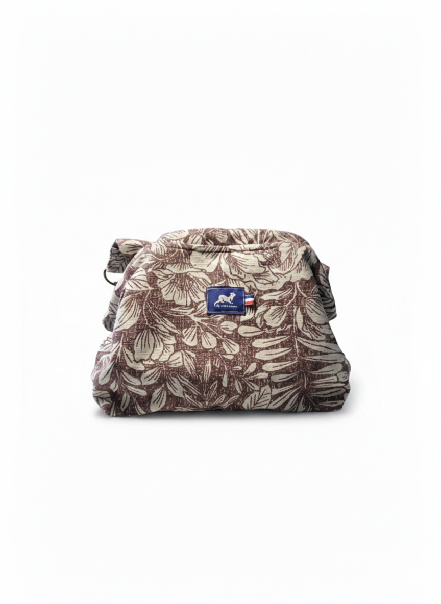 Découvrez le Sac Tutu EDITH en toile de coton grès et motifs floraux bordeaux, une création artisanale inspirée des sacs d’autrefois, revisitée avec modernité et légèreté.