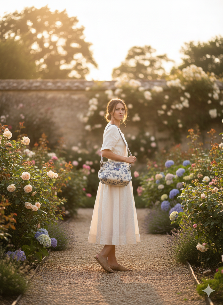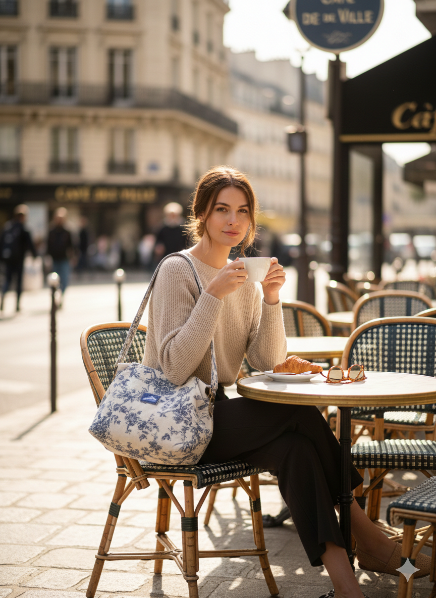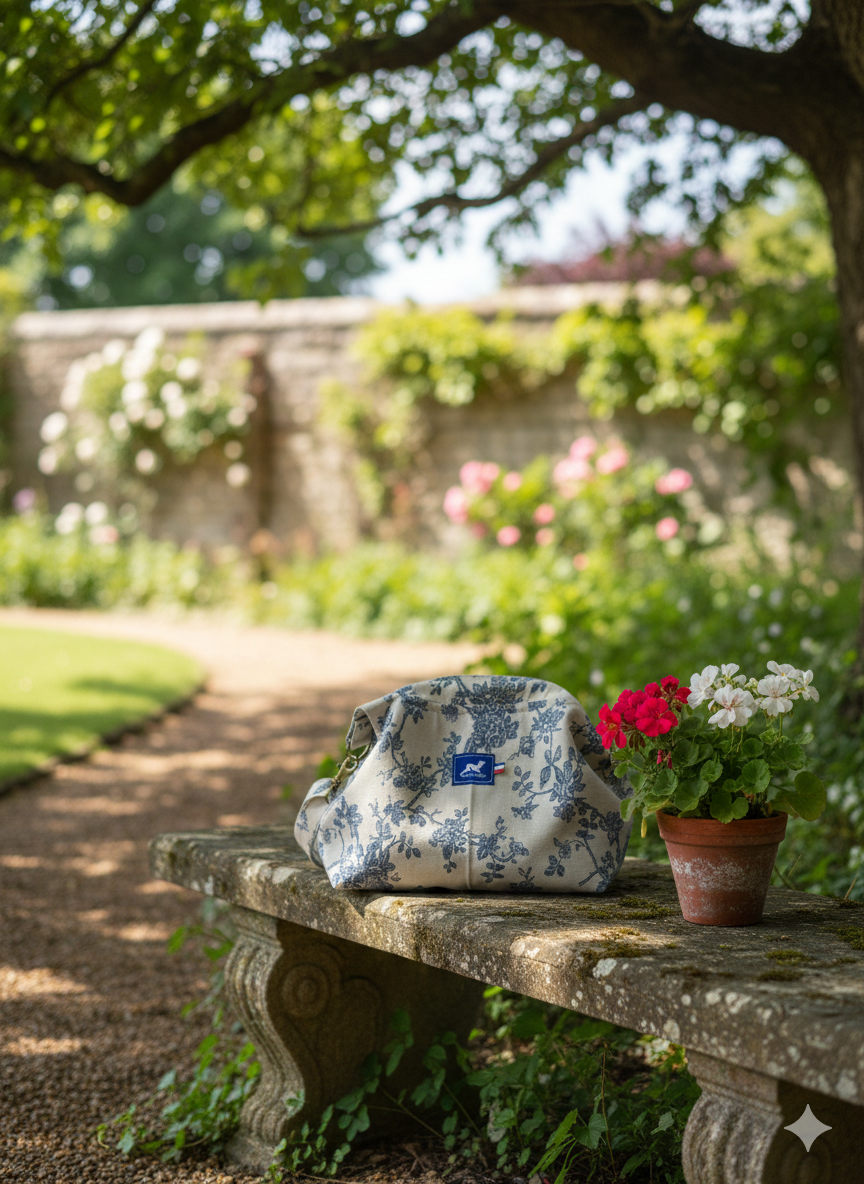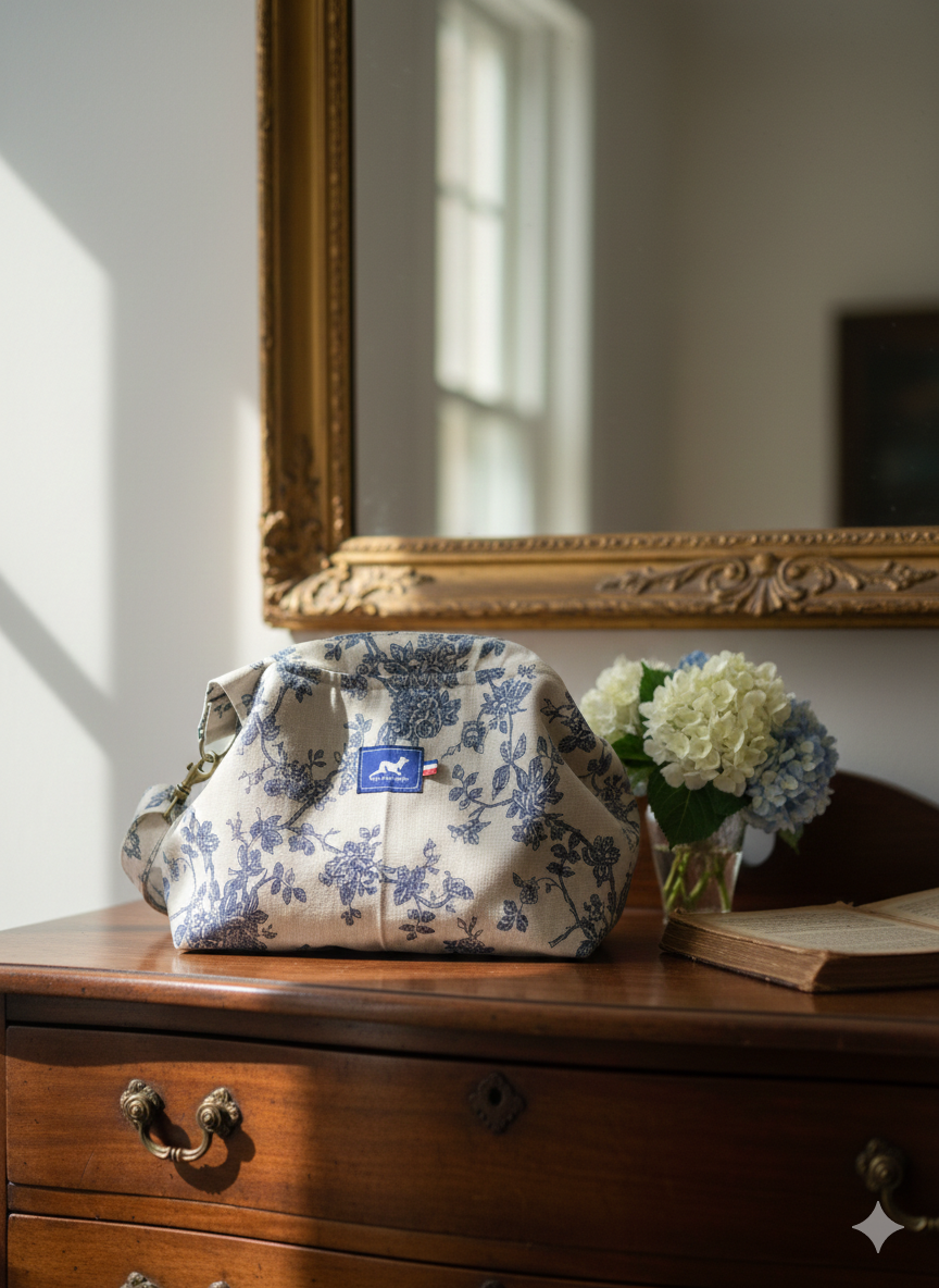 Découvrez le Sac Tutu MARIANNE LIN en toile de coton grès et motifs floraux bleus, une création artisanale inspirée des sacs d’autrefois, revisitée avec modernité et légèreté.
