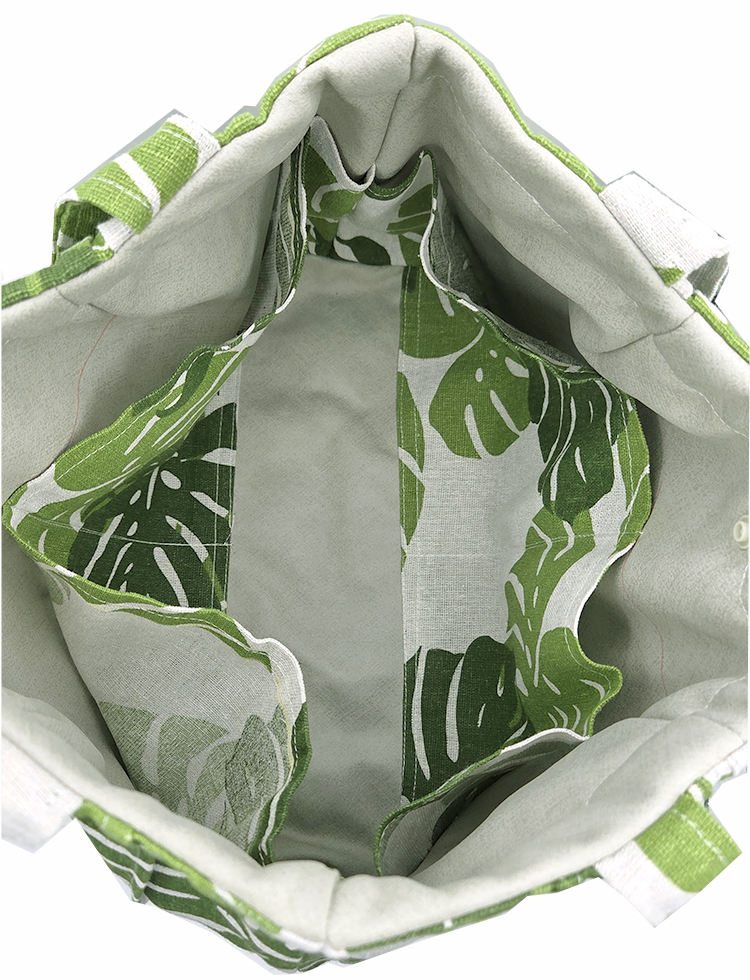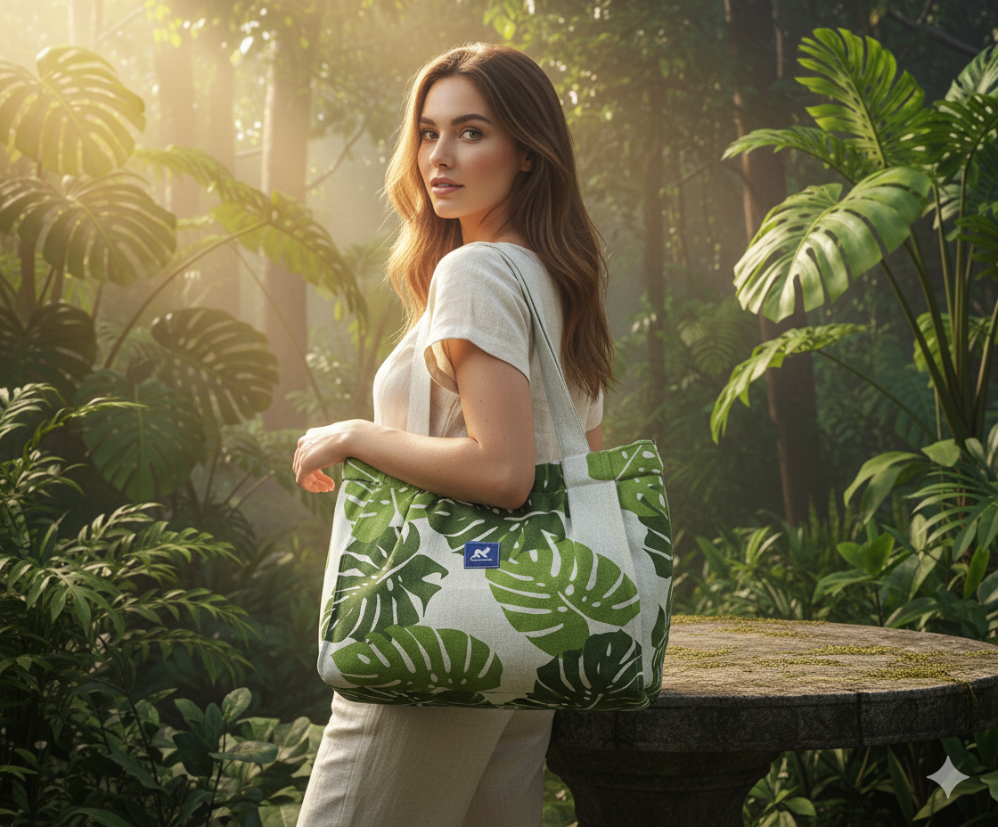 Découvrez le Tote Bag Mini MONSTERA, un sac cabas artisanal en tissu coton et lin beige, sublimé par de grandes feuilles de Monstera vertes.